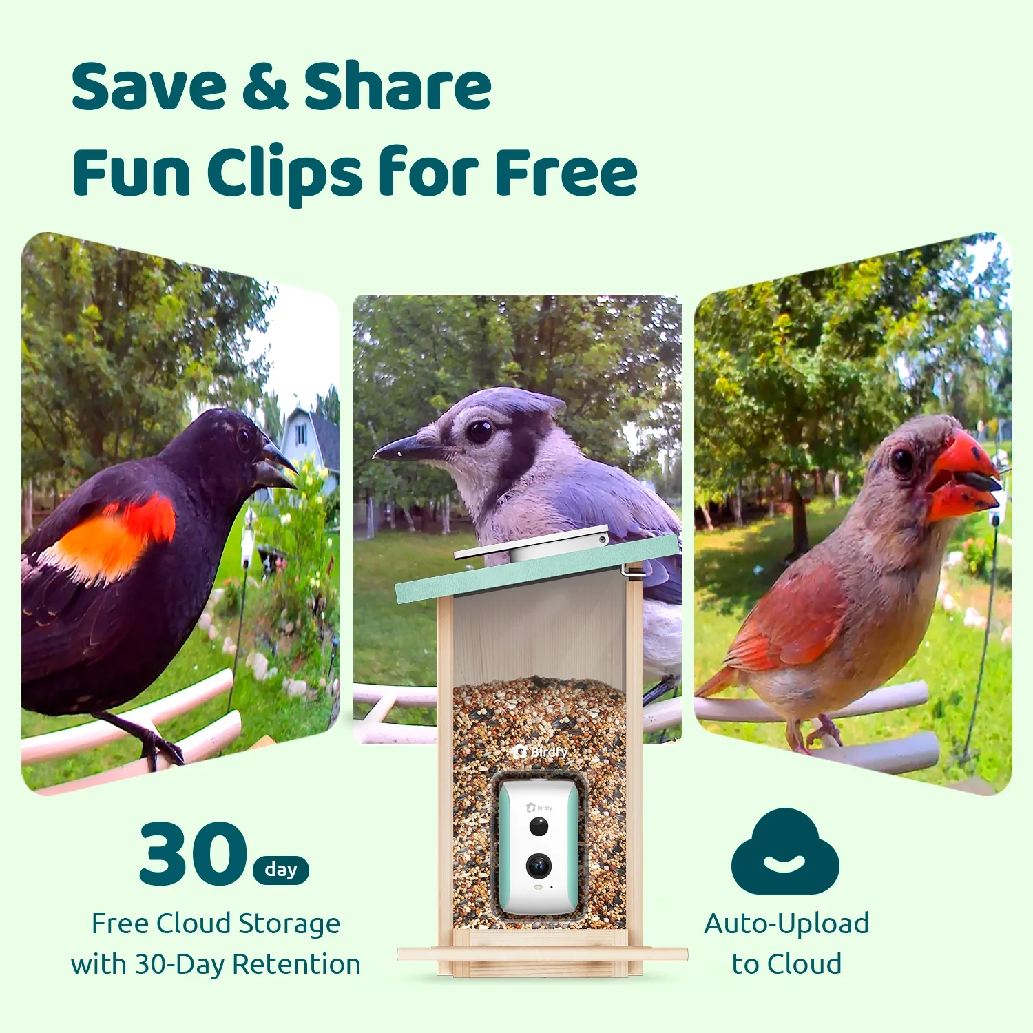 - Real-time Bird Watching: Receive instant notifications when birds visit, directly through the Birdfy app. Automatic recordings are stored in lifetime free cloud storage (data retention up to 30 days).